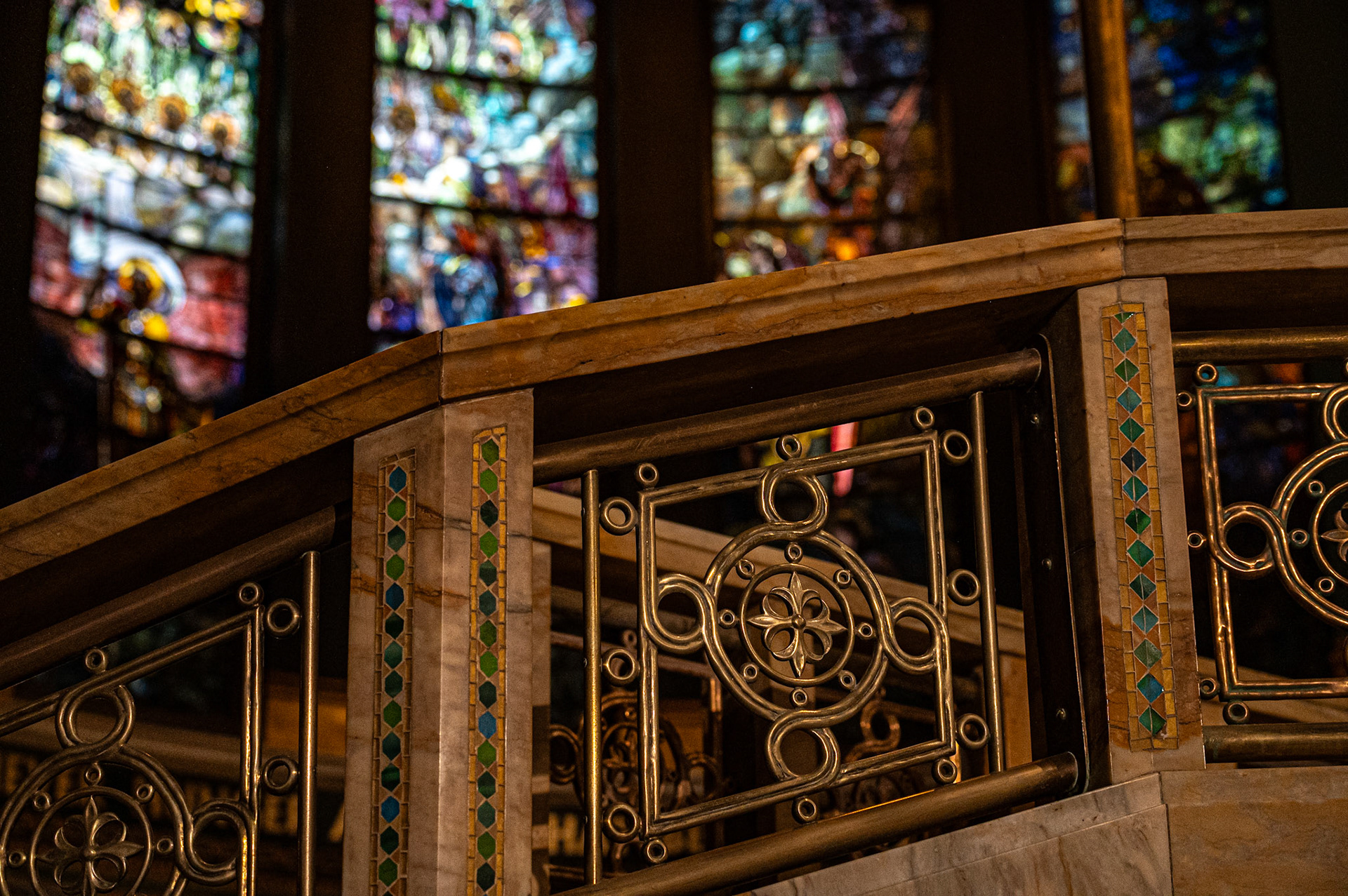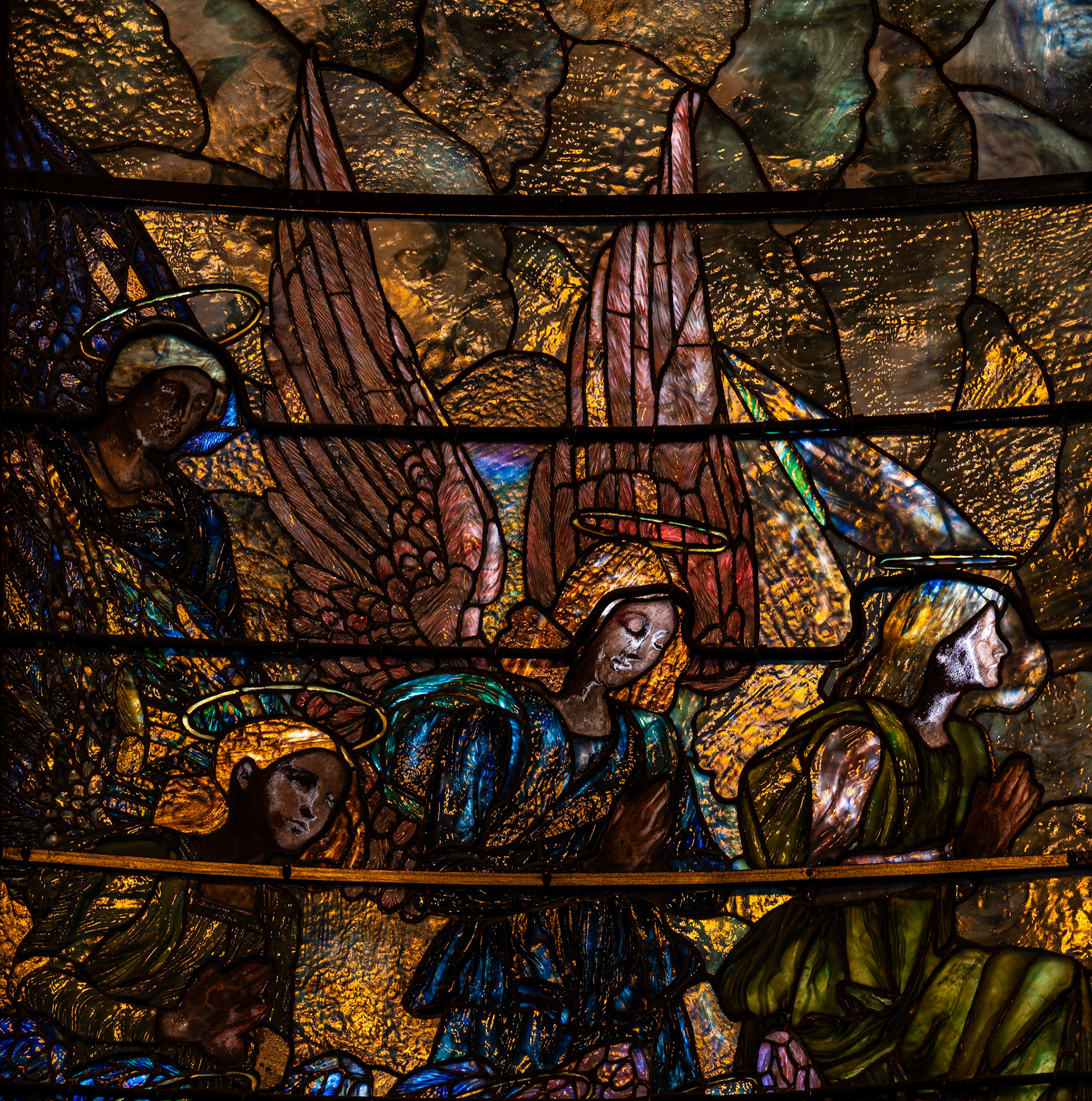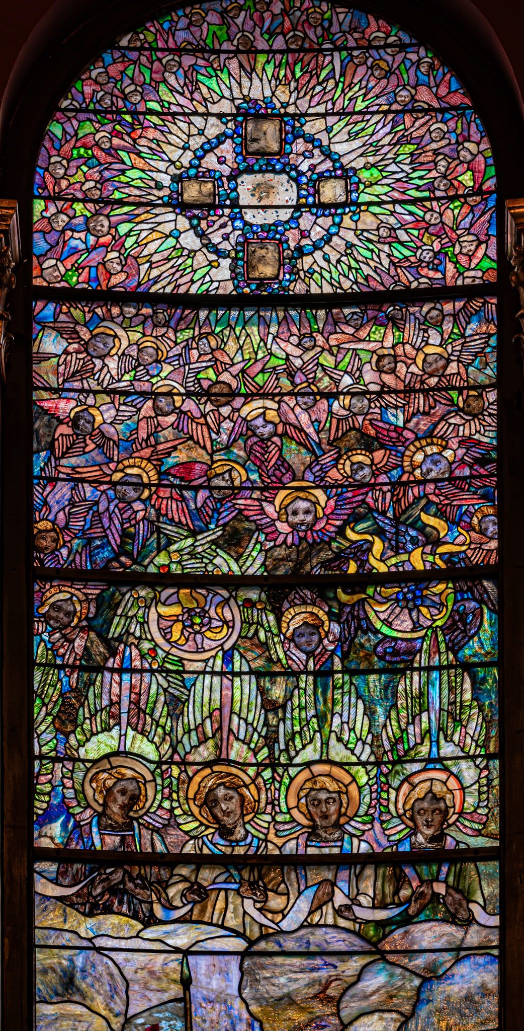 These windows were designed by Tiffany Studios and executed by Edward P. Sperry, Joseph Lauber, Louise J. Lederle, and Clara W. Parrish and measure 5x25ft. They depict St Michael’s victory in heaven, taken from Revelation 12:7-12. An interesting thing to note is the bible-accurate representation of seraphim, thrones, and cherubim, rather than only the typical cute cupid-like babies we see in most religious art and stained glass depictions of angels.
